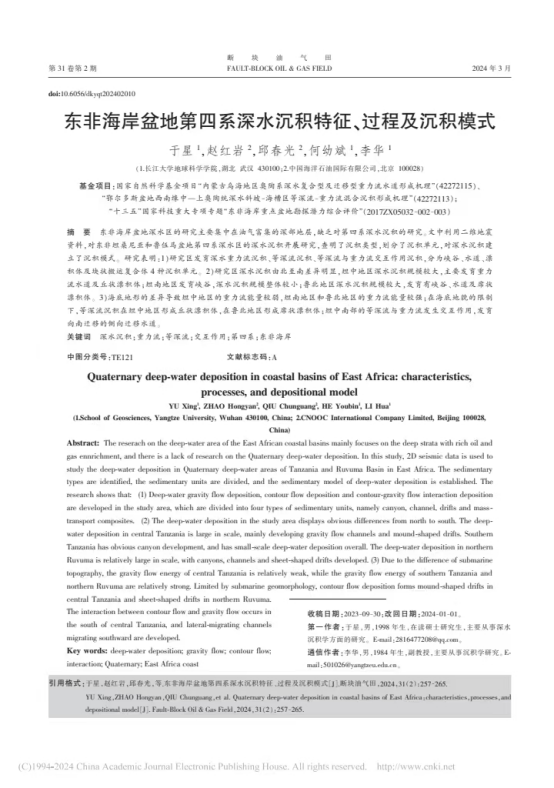 硕士生于星在《断块油气田》发表题为“东非海岸盆地第四系深水沉积特征、过程及沉积模式”的研究论文。嘟嘟成人网