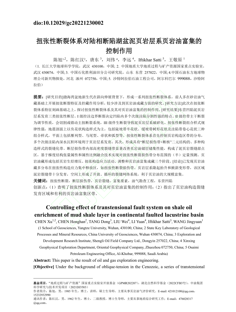陈旭副教授以第一作者身份在《中国地质》权威期刊上发表题为“扭张性断裂体系对陆相断陷湖盆泥页岩层系页岩油富集的控制作用”的研究论文,该项研究得到了湖北省自然科学基金的资助。