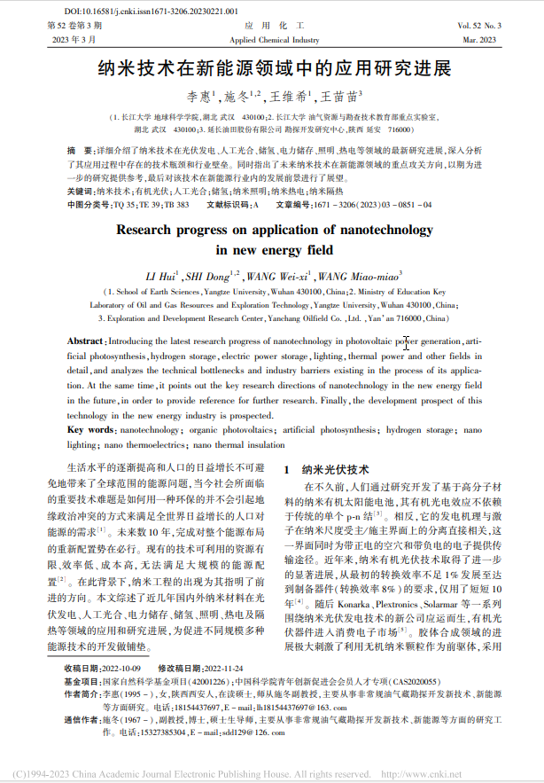硕士生李惠在中文期刊《应用化工》上发表了题为“纳米技术在新能源领域中的应用研究进展”的研究论文。嘟嘟成人网