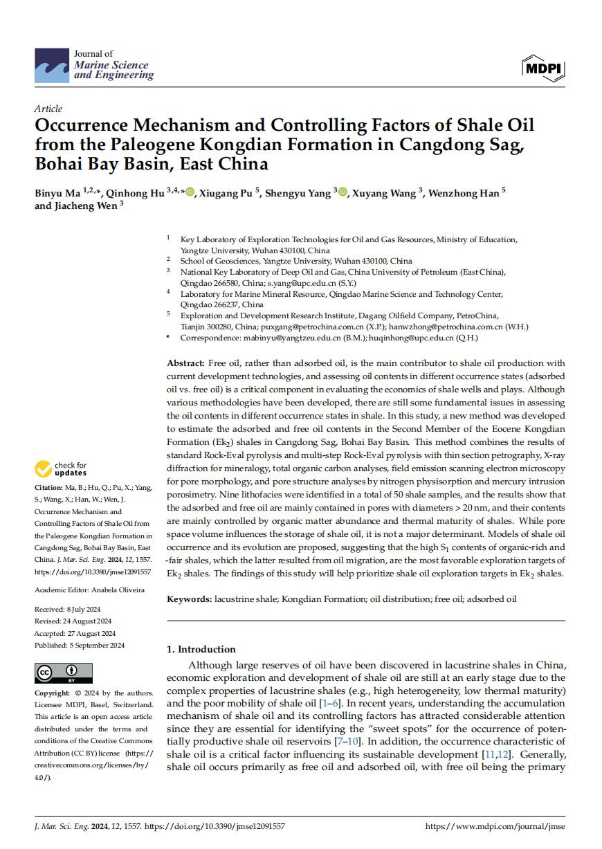 地质系马斌玉博士以第一作者身份在海洋地质学领域主流期刊《Journal of Marine Science and Engineering》(JMSE)上发表题为“Occurrence Mechanism and Controlling Factors of Shale Oilfrom the Paleogene Kongdian Formation in Cangdong Sag,Bohai Bay Basin, East China”的研究论文,该项研究得到了国家自然科学基金、中国博士后基金和油气资源与勘探技术教育部重点实验室开放基金的资助。