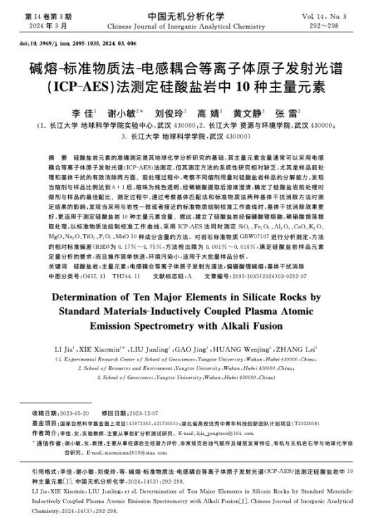 为第一单位在《中国无机分析化学》(北大核心)发表题为“碱熔-标准物质法-电感耦合等离子发射光谱法测定硅酸盐岩中的SiO2等十种主量元素”的研究成果。