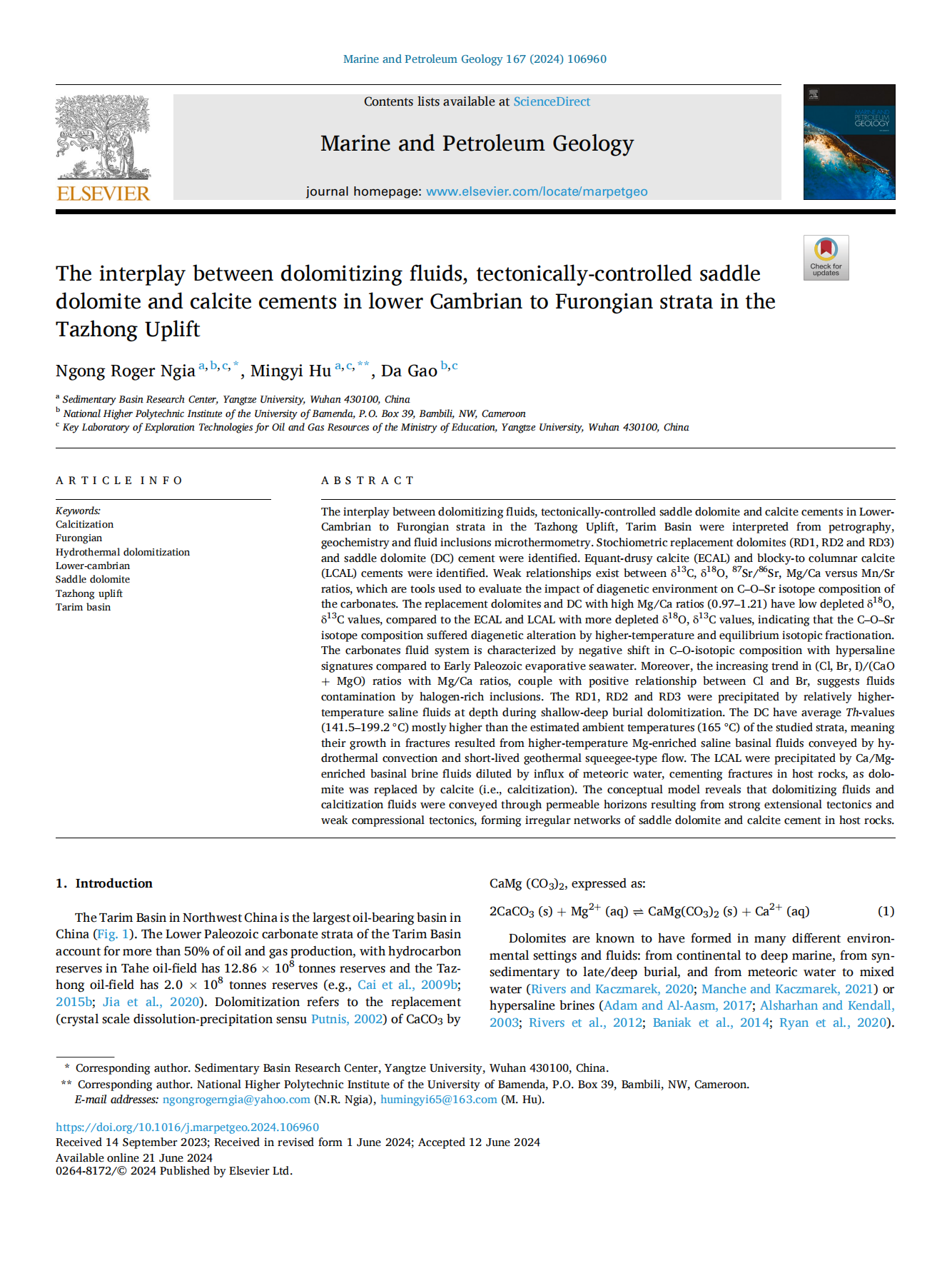 胡明毅教授团队在石油地质领域主流期刊《Marine and Petroleum Geology》发表了题为“The interplay between dolomitizing fluids, tectonically-controlled saddle dolomite and calcite cements in lower Cambrian to Furongian strata in the Tazhong Uplift”的研究论文。