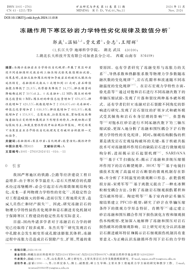 温韬教授团队长期从事冻融岩石力学、滑坡演化机理及预测与防治、岩土体稳定性评价与数值模拟、岩石力学特性表征、机器学习等方面的研究,团队硕士生郭威在核心期刊《矿业研究与开发》上发表题为《冻融作用下寒区砂岩力学特性劣化规律及数值分析》的研究论文。嘟嘟成人网