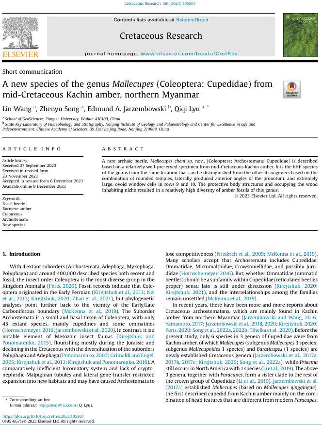 吕奇奇、宋振宇两位老师共同指导下,在地球科学与古生物学领域期刊《Cretaceous Research》上发表题为“A new species of the genusMallecupes(Coleoptera: Cupedidae) from mid-Cretaceous Kachin amber, northern Myanmar”的研究论文。