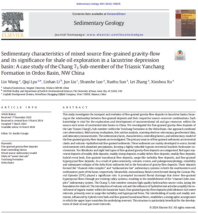 硕士生王林在《Sedimentary Geology》发表题为“Sedimentary characteristics of mixed source fine-grained gravity-flow and its significance for shale oil exploration in a lacustrine depression basin: A case study of the Chang 73Sub-member of the Triassic Yanchang Formation in Ordos Basin, NW China”的研究论文。嘟嘟成人网