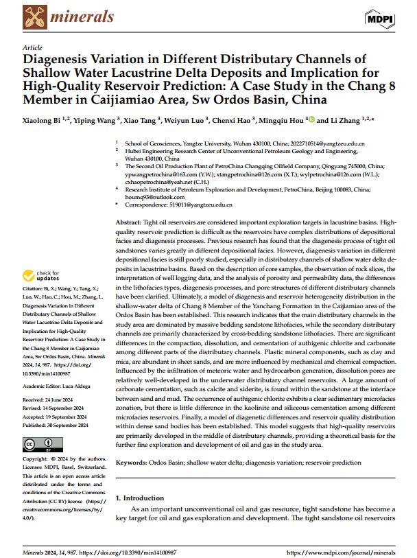 地科院硕士生毕小龙在张莉副教授的指导下,在期刊《Minerals》上发表题为《Diagenesis Variation in Different Distributary Channels of Shallow Water Lacustrine Delta Deposits and Implication for High-Quality Reservoir Prediction: A Case Study in the Chang 8 Member in Caijiamiao Area, Sw Ordos Basin, China》的研究论文,嘟嘟成人网