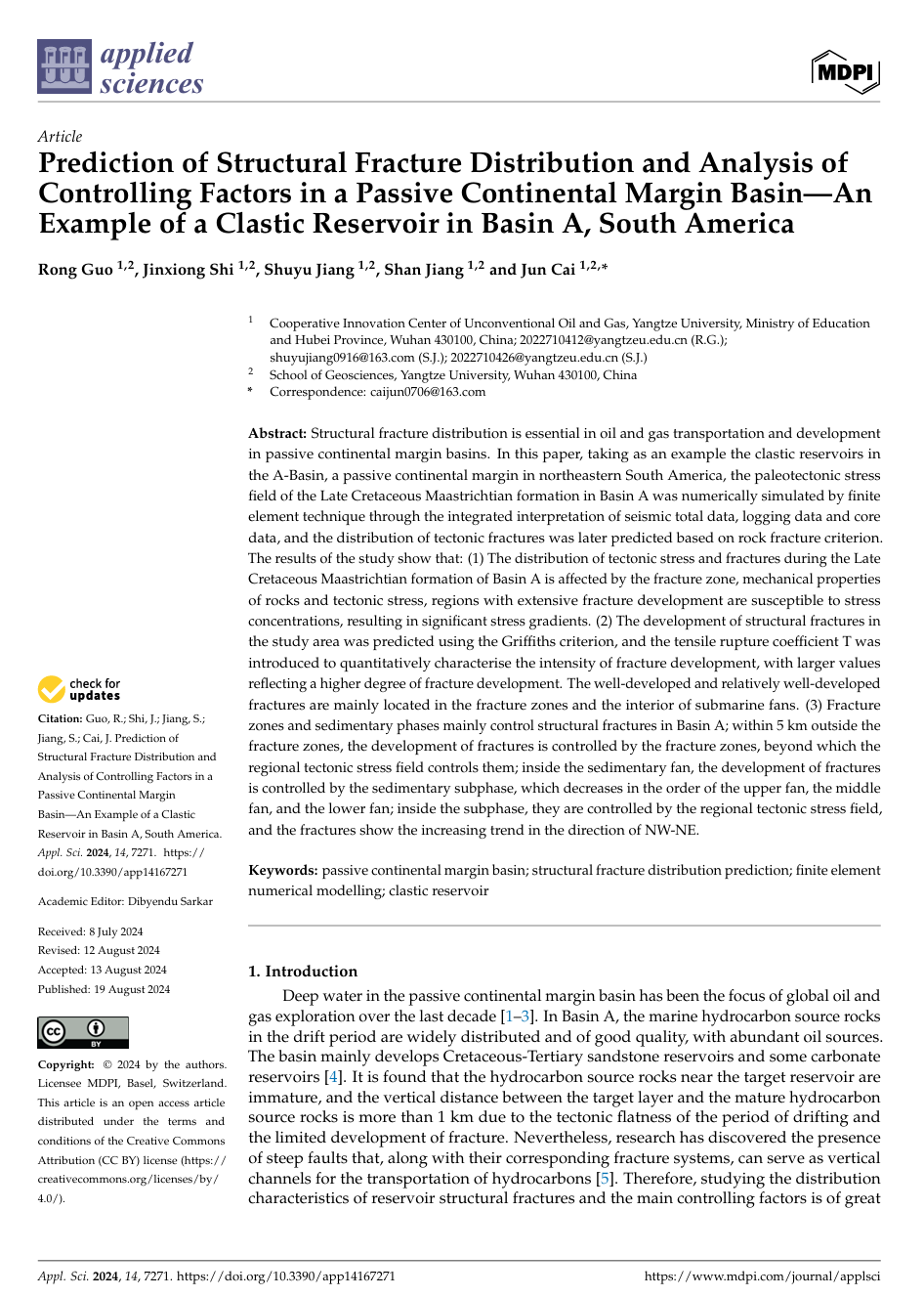 硕士研究生郭蓉在《applied sciences》上发表题目为“Prediction of Structural Fracture Distribution and Analysis of Controlling Factors in a Passive Continental Margin Basin—An Example of a Clastic Reservoir in Basin A, South America”的研究论文。该研究通过采用有限元构造数值模拟技术,探讨了被动陆缘盆地的古构造应力场及其裂缝分布特征。研究结果表明被动陆缘盆地先存断裂区域容易出现应力集中,有利于裂缝发育,有效控制距离可达5公里;较大的伸展破裂系数表明被动陆缘海底扇内部也是裂缝发育的优势指向区,发育强度的差异受控于岩石力学参数的变化。
