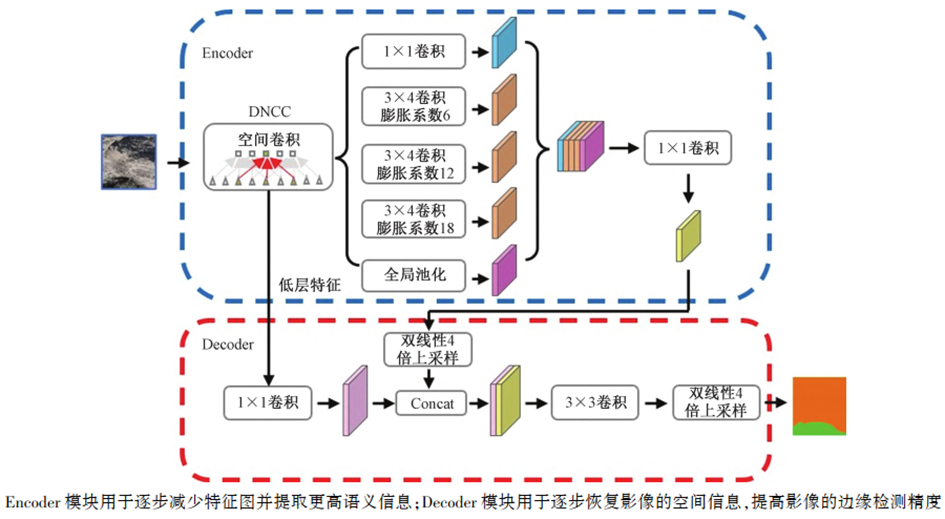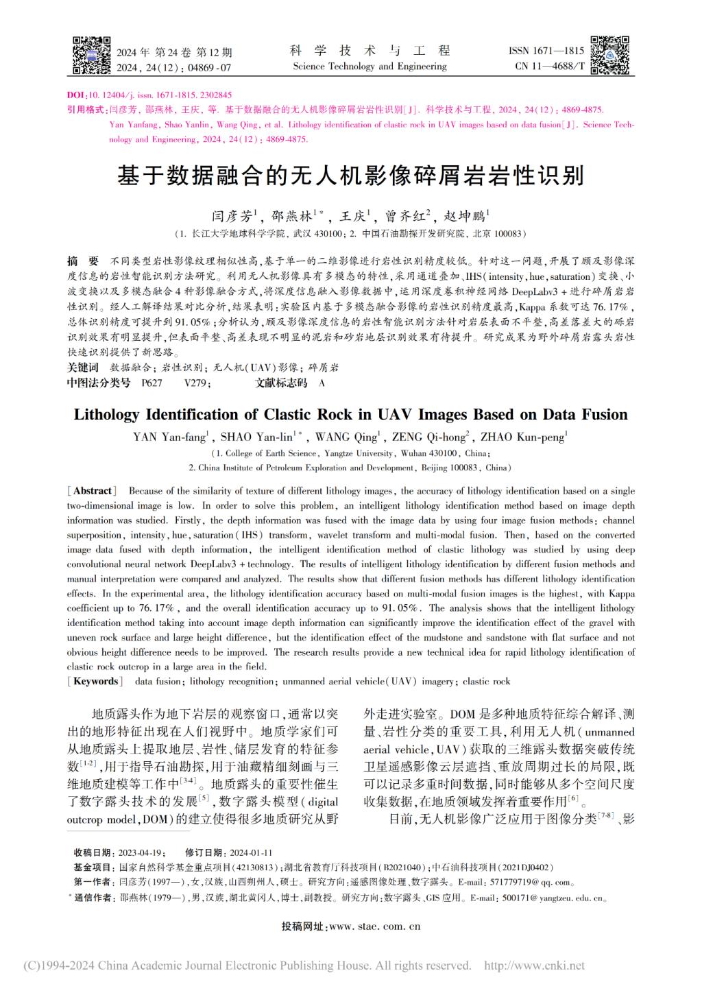 该研究旨在解决单一二维影像岩性识别精度低的问题,开展了顾及影像深度信息的岩性智能识别方法研究。以准噶尔盆地南缘露头为研究区(图1),利用无人机获取 RGB 影像和 DSM 影像,通过通道叠加、IHS 变换、小波变换和多模态融合 4 种方式将深度信息融入影像数据,采用 DeepLabv3 + 模型进行碎屑岩岩性识别,并对比分析不同融合方法和人工解译结果(图2)。