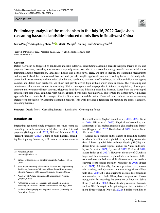 陈宁生教授团队在《Bulletin of Engineering Geology and the Environment》发表了题为“Preliminary analysis of the mechanism in the July 16, 2022 Gaojiashan cascading hazard: a landslide-induced debris flow in Southwest China”的研究论文。陈宁生教授为通讯作者,嘟嘟成人网