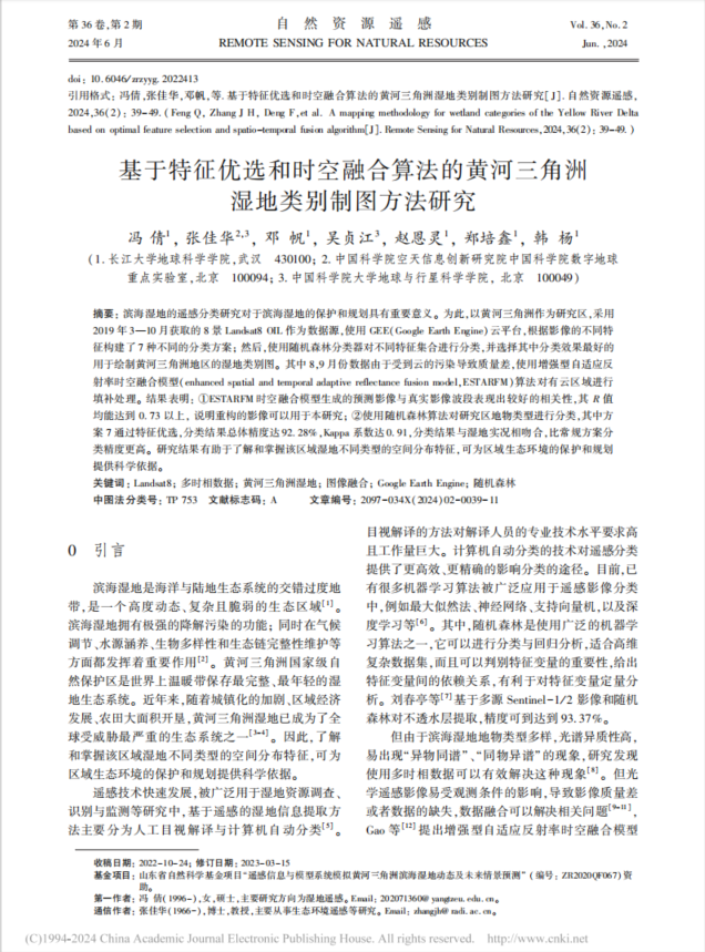 邓帆课题组硕士生冯倩在北大核心期刊自然资源遥感发表题目为“基于特征优选和时空融合算法的黄河三角洲湿地类别制图方法研究”的研究论文。嘟嘟成人网