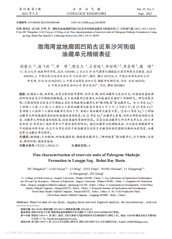 胡望水教授以第一作者身份在《岩性油气藏》权威期刊上发表题为“渤海湾盆地廊固凹陷古近系沙河街组油藏单元精细表征”的研究论文,高飞跃硕士为通讯作者。该项研究得到了国家科技重大专项“渤海湾盆地精细勘探评价关键技术的资助。