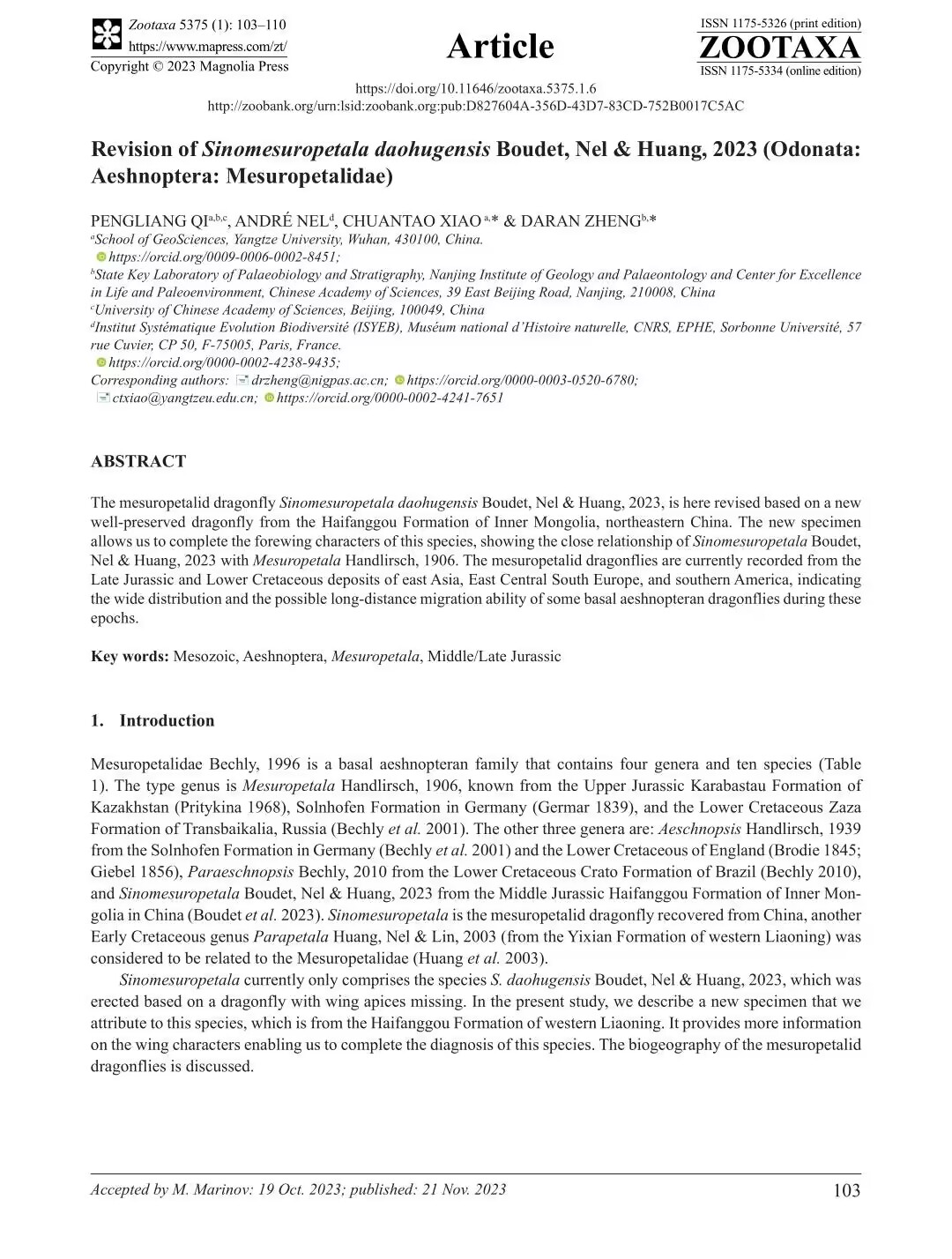 地质资源与地质工程专业硕士生漆鹏亮在古生物学期刊《ZOOTAXA》上发表题为“Revision of Sinomesuropetala daohugensis Boudet, Nel & Huang, 2023 (Odonata:Aeshnoptera: Mesuropetalidae)”的研究论文。嘟嘟成人网