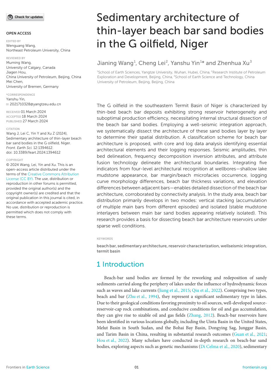 硕士研究生王嘉宁在《Frontiers in Earth Science》上发表题目为“Sedimentary architecture of thin-layer beach bar sand bodies in the G oilfield, Niger”的研究论文。嘟嘟成人网