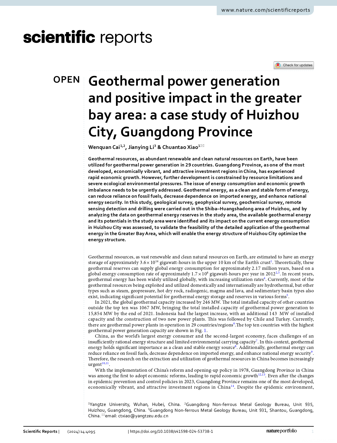 地质学专业硕士生蔡文权在国际综合类科技期刊《Scientific Reports》上发表题为“Geothermal power generation and positive impact in the greater bay area: a case study of Huizhou City, Guangdong Province”的研究论文。嘟嘟成人网