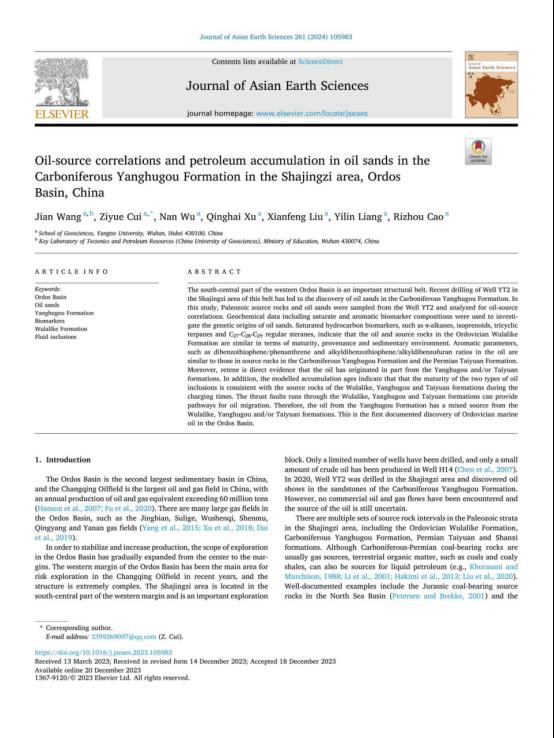 王健在《Journal of Asian Earth Sciences》发表题为“Oil-source correlations and petroleum accumulation in oil sands in the Carboniferous Yanghugou Formation in the Shajingzi area, Ordos Basin, China”的研究论文。嘟嘟成人网