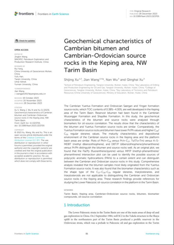 王健在《Frontiers in Earth Science》发表题为“Geochemical characteristics of Cambrian bitumen and Cambrian-Ordovician source rocks in the Keping area, NW Tarim Basin”的研究论文。嘟嘟成人网