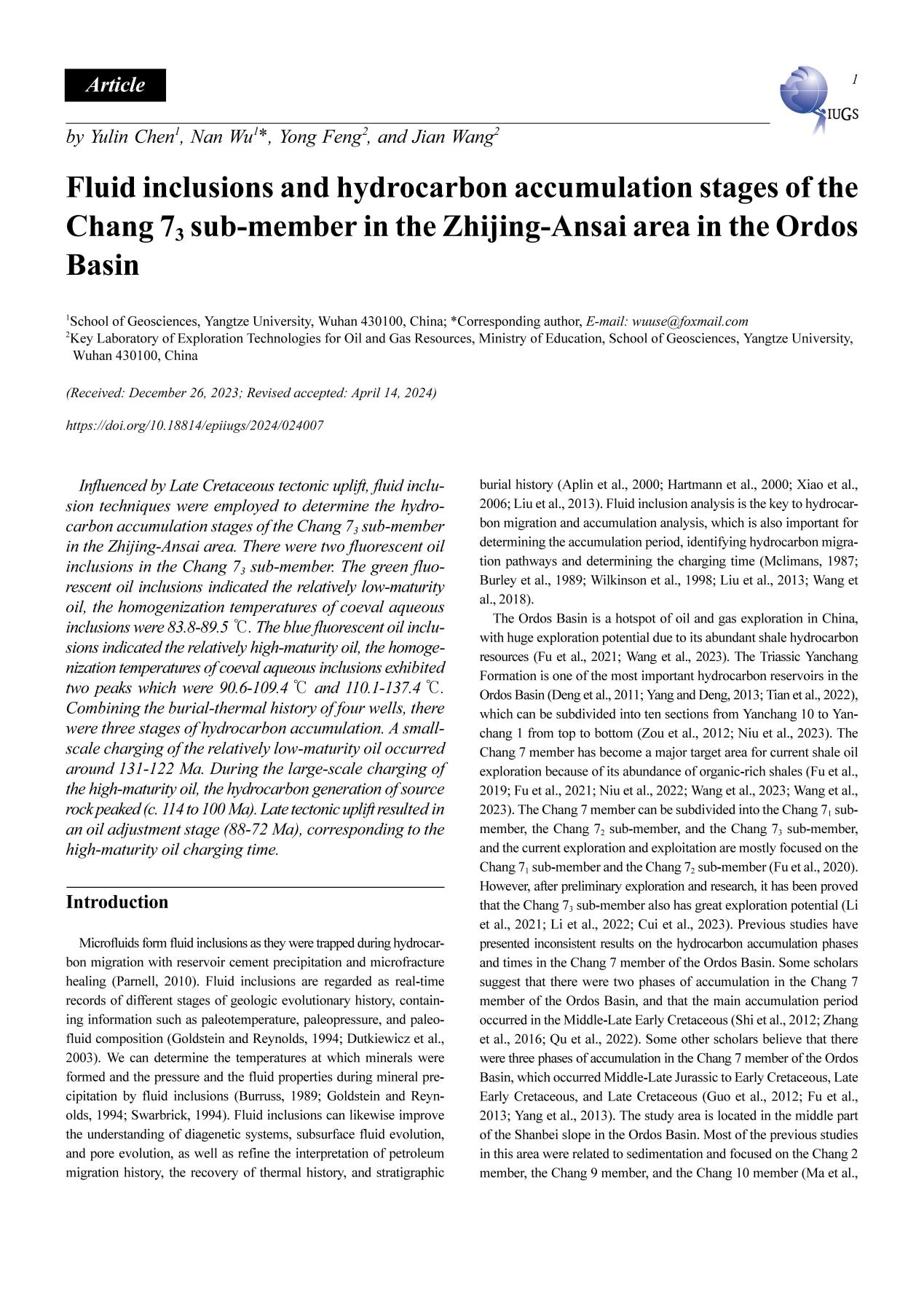 硕士生陈雨霖在《EPISODES》上发表题为“Fluid inclusions and hydrocarbon accumulation stages of the Chang 73 sub-member in the Zhijing-Ansai area in the Ordos Basin”的研究论文。嘟嘟成人网