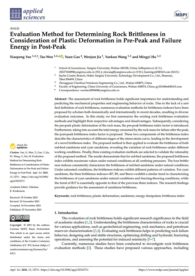 岳晓朋在《Applied Sciences-Basel》上发表题为“Evaluation Method for Determining Rock Brittleness in Consideration of Plastic Deformation in Pre-Peak and Failure Energy in Post-Peak”的研究论文。嘟嘟成人网
