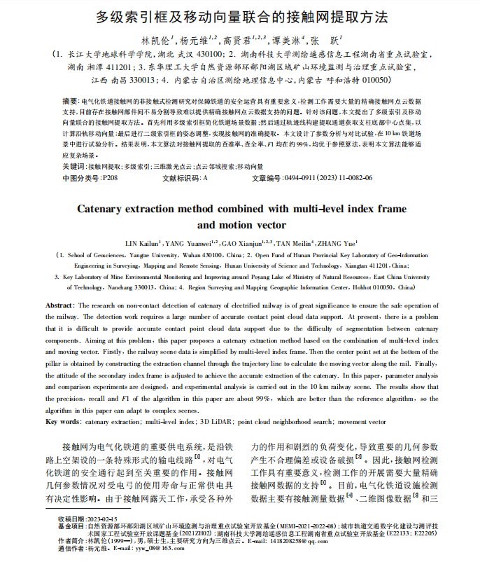 硕士生林凯伦在测绘领域主流期刊《测绘通报》上发表题为“多级索引框及移动向量联合的接触网提取方法”的研究论文。