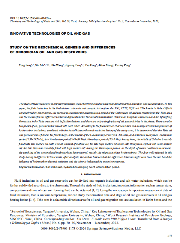 研究生母鑫以通讯作者身份在《CHEMISTRY AND TECHNOLOGY OF FUELS AND OILS》上发表题为“Study on the Geochemical Genesis and Differences of Ordovician Oil and Gas Reservoirs”的研究论文。对含油气盆地流体包裹体的研究,是认识油气运移和成藏的有效方法。文章通过实验对塔河油田TS3井、TP18井、YQ8井和YJ2-3井随钻取出的奥陶系碳酸盐岩地层样品中的流体包裹体进行分析,旨在探究塔河地区奥陶系油气藏的成藏期次及不同区块之间存在差异的原因。结果表明:塔河地区奥陶系鹰山组和一间房组地层流体包裹体种类丰富,相态上既有油、气、盐水单一相,同样存在油、气、水的两相或多相。根据烃类包裹体的荧光特性和均一温度,结合研究区的埋藏史-热演化史分析确定出塔河油田油气藏为4期充注,分别是加里东中期(454-446Ma)、海西晚期-印支期(255-217Ma)、燕山晚期(143-99Ma)、喜马拉雅期(25-5Ma)。其中加里东中期主要为低熟油充注,夹少量成熟油;海西晚期主要高熟油,夹部分成熟油的充注;燕山晚期主要是高熟油的充注;喜马拉雅期随着埋深的不断增加,发生油气藏的裂解,主要是气烃的活动。本次研究所选的4口井属于不同的构造单元,经过分析笔者认为单井之间的差异一方面是烃类热演化程度的影响,另一方面是受构造运动的影响。