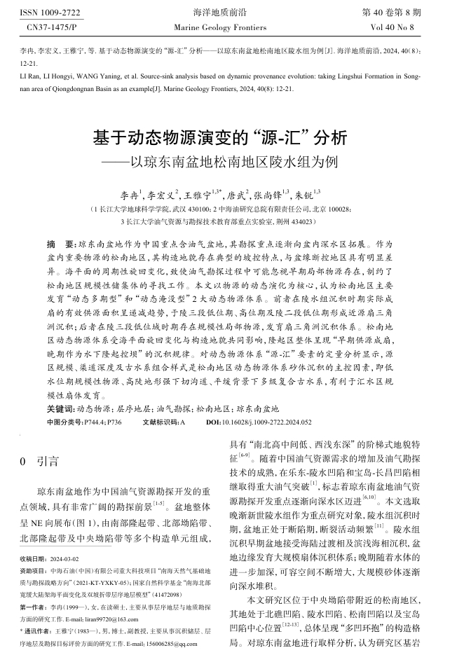 硕士生李冉在《海洋地质前沿》发表题为“基于动态物源演变的“源-汇”分析—以琼东南盆地松南地区陵水组为例”的研究论文。嘟嘟成人网