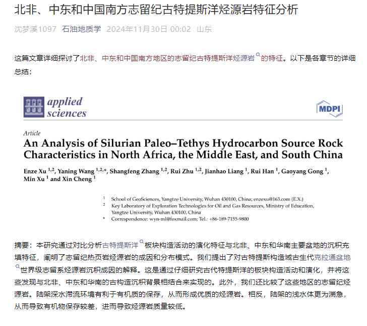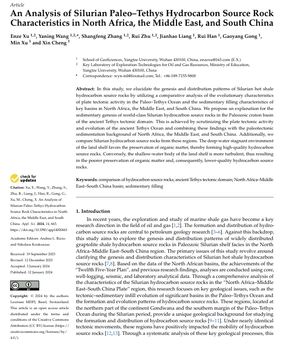 博士生徐恩泽在Applied Sciences-Basel发表题为“An Analysis of Silurian Paleo–Tethys Hydrocarbon Source Rock Characteristics in North Africa, the Middle East, and South China”的研究论文,通讯作者为王雅宁副教授。