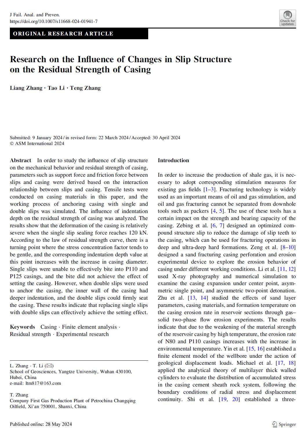 研究生张亮以通讯作者身份在EI期刊《Journal of Failure Analysis and Prevention》上发表题为“Research on the Influence of Changes in Slip Structure on the Residual Strength of Casing”的研究论文,嘟嘟成人网