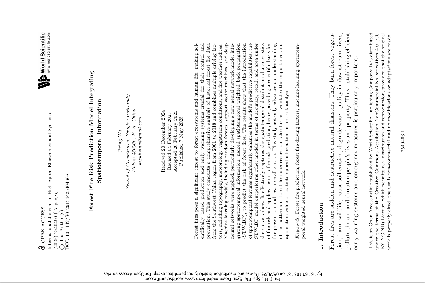 硕士生吴集星在EI收录期刊《International Journal of High Speed Electronics and Systems》上发表题为“Forest Fire Risk Prediction Model Integrating Spatiotemporal Information”的研究论文。嘟嘟成人网