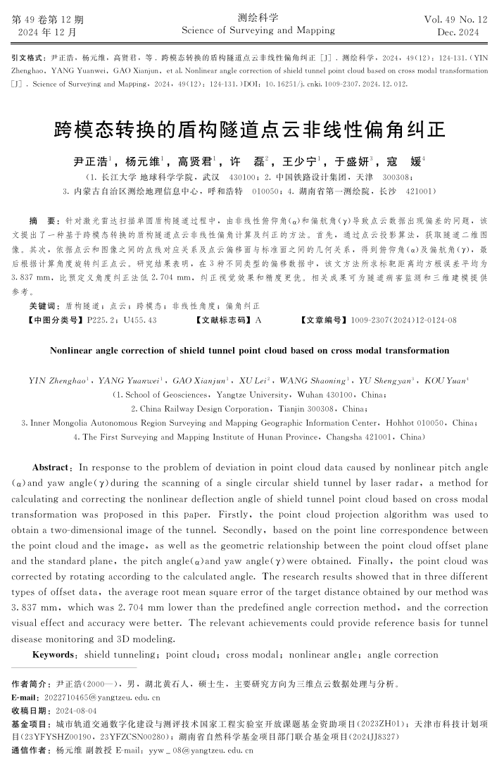 研究生尹正浩以第一作者身份在北大核心期刊《测绘科学》上发表题为“跨模态转换的盾构隧道点云非线性偏角纠正”的研究论文,嘟嘟成人网