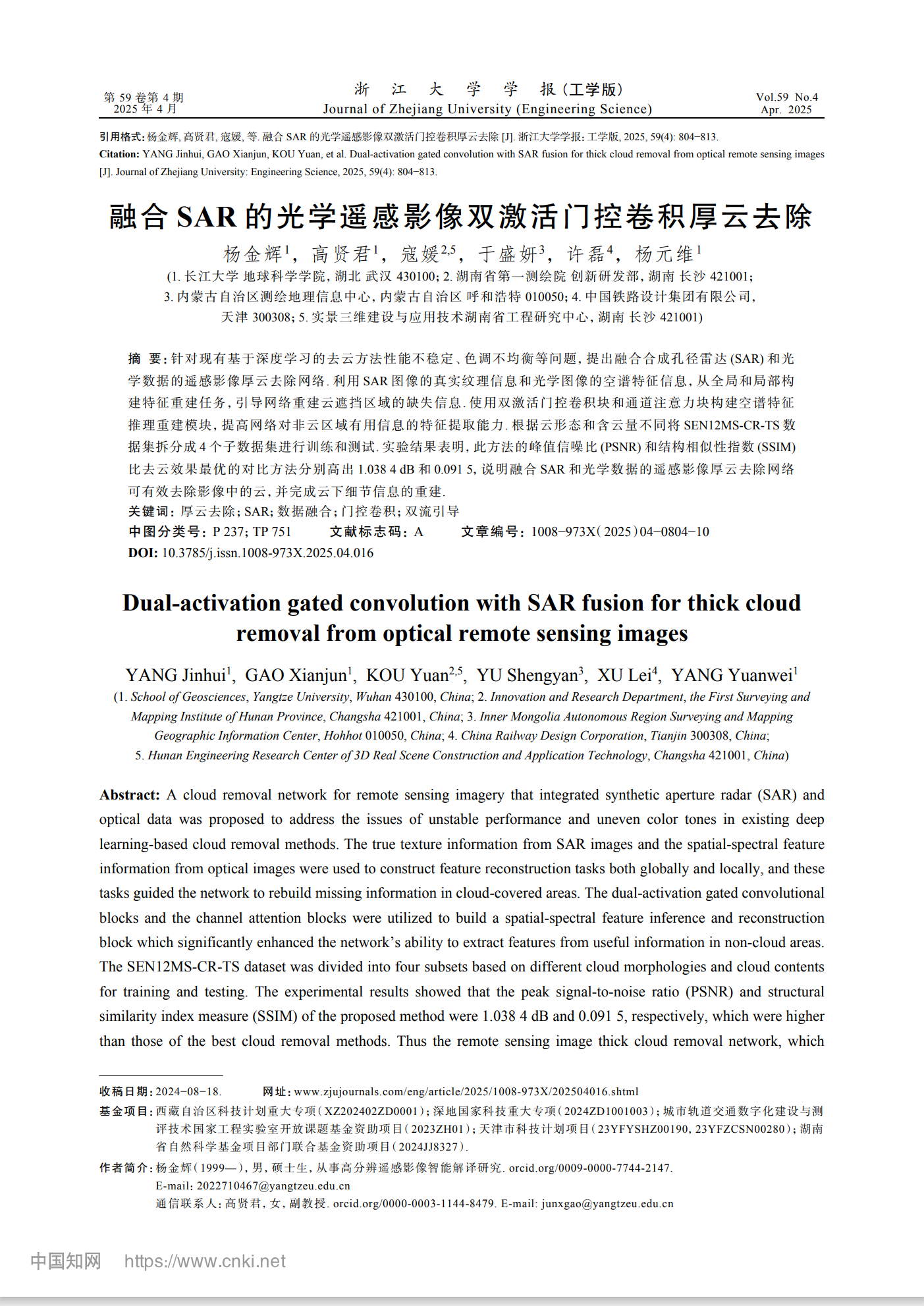 地图制图学与地理信息工程专业2022级研究生杨金辉在EI期刊《浙江大学学报(工学版)》发表题为“融合SAR的光学遥感影像双激活门控卷积厚云去除”的研究论文。嘟嘟成人网
