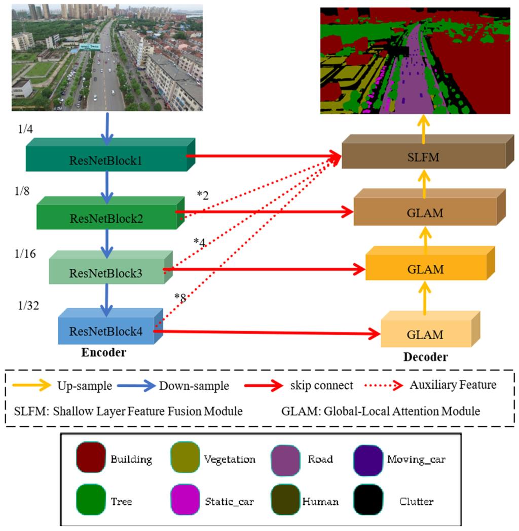 在无人机图像的实时语义分割中,当前的轻量级算法缺乏图像中全局和局部信息的整合,导致分类类别中的漏检和误分类。本文提出了一种集成多尺度全局上下文信息的无人机实时语义分割方法。该原理利用UNet结构,编码器采用Resnet18网络来提取特征。解码器包含一个全局-局部注意力模块,其中全局分支在垂直和水平方向上压缩和提取全局信息,局部分支通过卷积提取局部信息,从而增强图像中全局和局部信息的融合。在实时无人机语义分割上,该方法有效平衡了精度和实时性。
