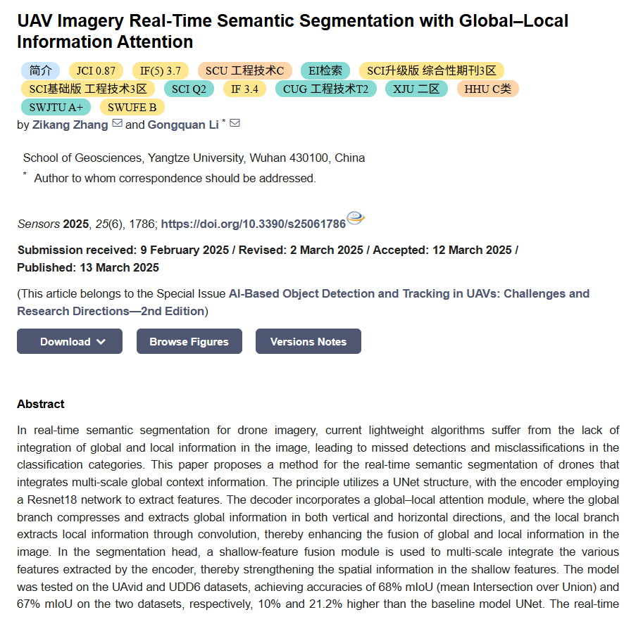 硕士研究生张子康在国际学术期刊《Sensors》上发表了题为“UAV Imagery Real-Time Semantic Segmentation with Global–Local Information Attention”的SCI论文,提出了一种利用全局-局部注意力和特征融合的方法用于对无人机实时图像进行语义分割。