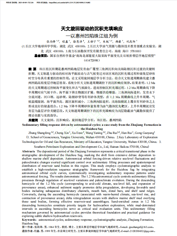 张尚锋教授在《断块油气田》上发表题为“天文旋回驱动的沉积充填响应—以惠州凹陷珠江组为例”的研究论文。嘟嘟成人网