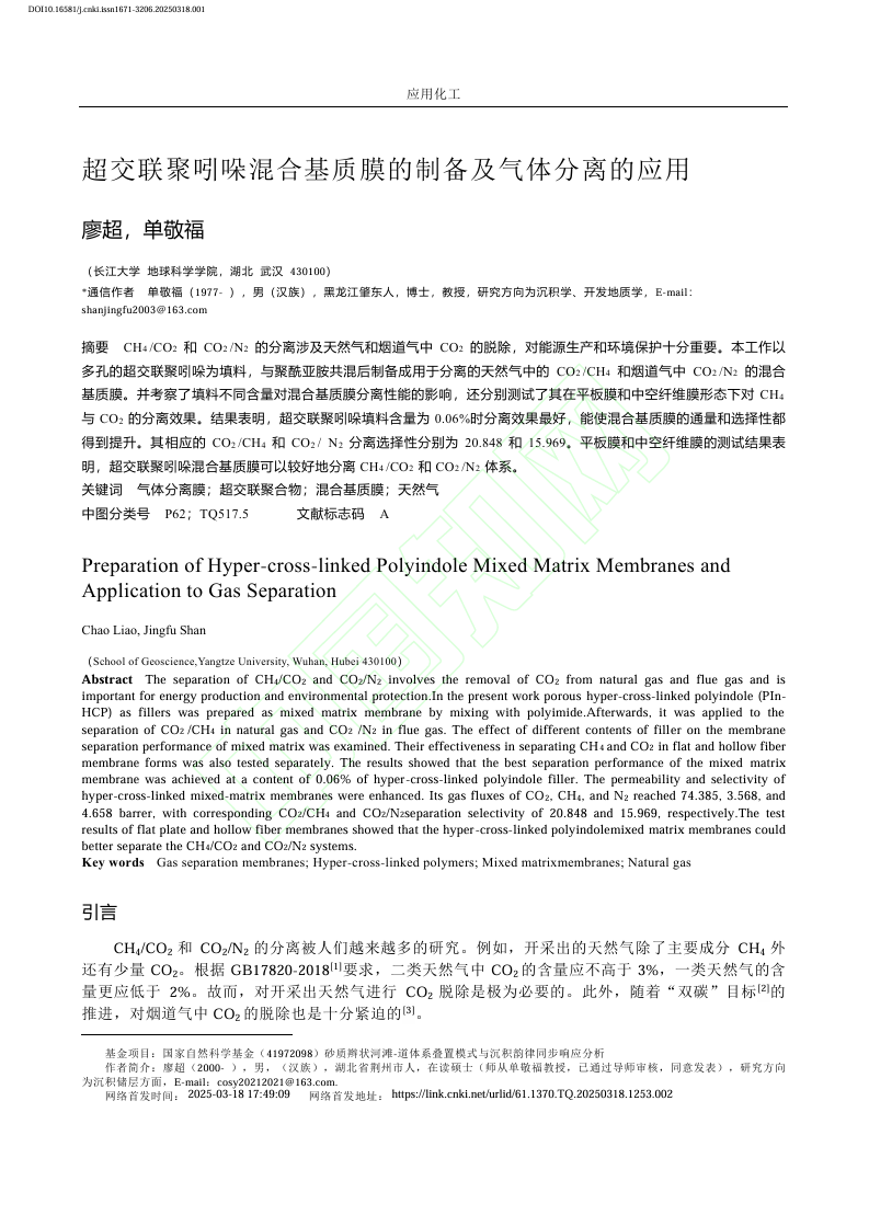 硕士生廖超在中文核心期刊《应用化工》上发表题为“超交联聚吲哚混合基质膜的制备及气体分离的应用”的研究论文。该论文以多孔的超交联聚吲哚为填料,与聚酰亚胺共混后制备成用于分离的天然气中的CO2/CH4和烟道气中CO2/N2的混合基质膜。嘟嘟成人网
