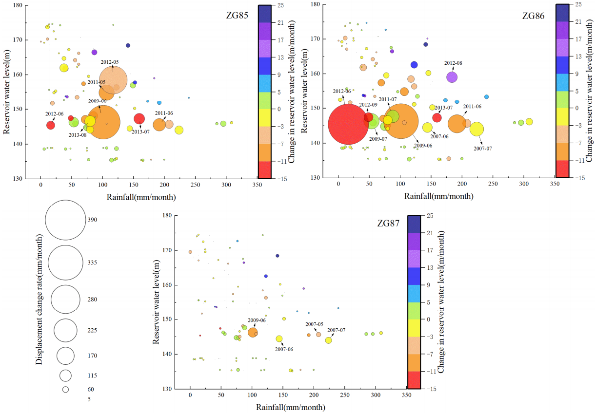 论文提出了以三峡库区叔坪滑坡为例,通过时间序列模型 (TSM)将位移分解为两个分量。选择基于降雨量和水库水位优化的最小二乘支持向量机(LSSVM)模型来预测基于降雨和库水位的滑坡位移预测。选择五个参数作为输入变量,包括单月降雨量、双月降雨量、库水位、上月库水位变化和半年周期位移。通过灰色相关分析揭示了5个参数与滑坡位移之间的关系。PSO-LSSVM模型用于预测周期项位移,应用最小二乘法预测趋势项位移。在相同的输入变量下,还建立了反向传播(BP)模型和 PSO-SVM 模型进行比较分析。PSO-LSSVM模型在3个模型中的的R2最大,为0.98,MAE值和RMSE值最小。结果表明,PSO-LSSVM模型在预测滑坡位移方面具有很高的准确性。