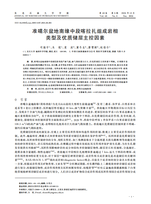研究生司振宇以第一作者身份在北大核心期刊《东北石油大学学报》上发表题为“准噶尔盆地南缘中段喀拉扎组成岩相类型及优质储层主控因素”的研究论文,嘟嘟成人网