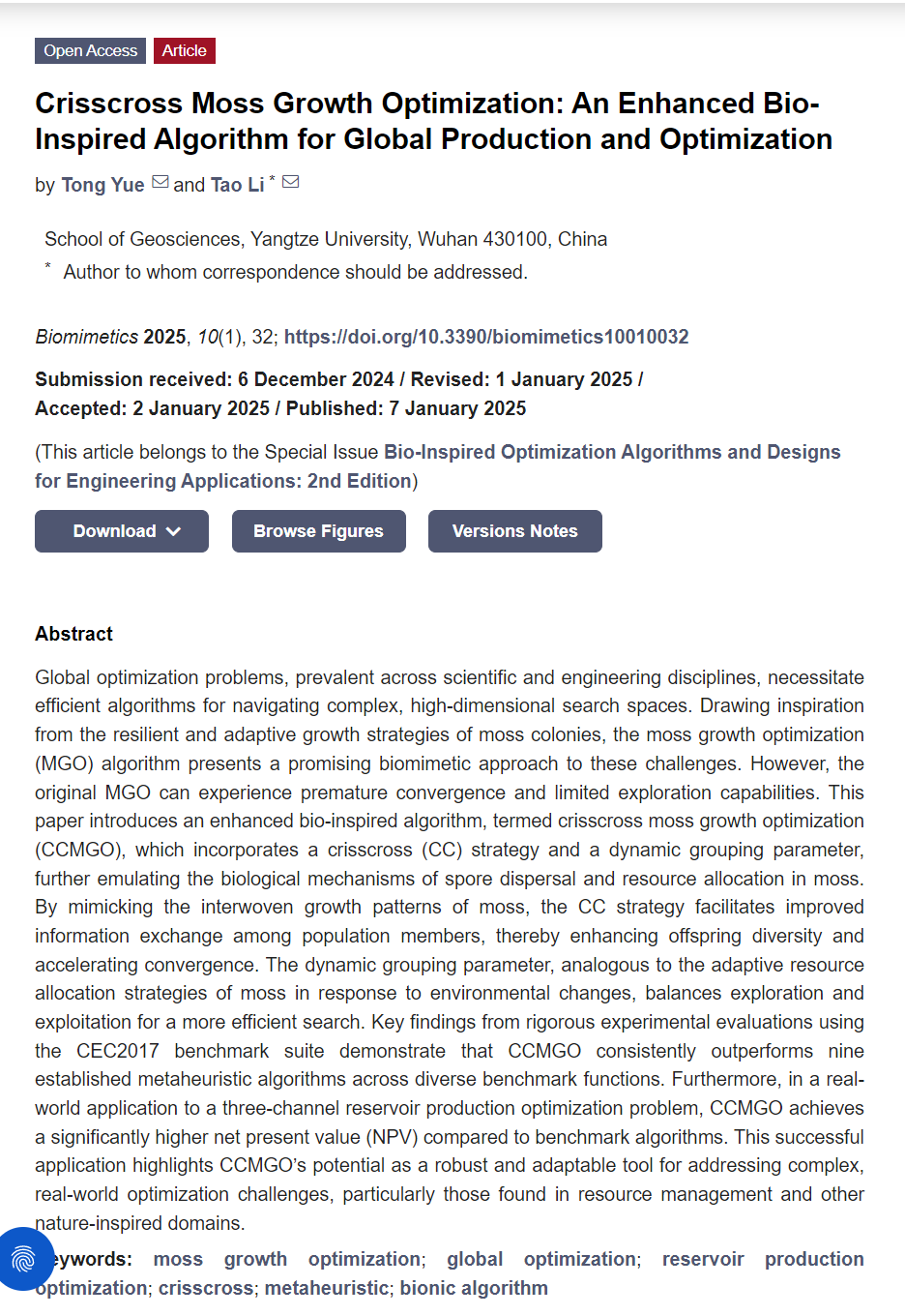 硕士研究生岳彤在期刊《Biomimetics》上发表题为“Crisscross Moss Growth Optimization: An Enhanced Bio-Inspired Algorithm for Global Production and Optimization”的研究论文。嘟嘟成人网