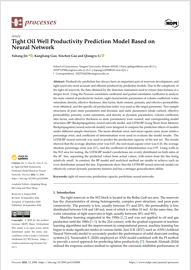 地质学专业2022级研究生金宇航在SCI三区期刊《Processes》(IF=2.8)发表题为"Tight Oil Well Productivity Prediction Model Based on Neural Network"的研究论文。嘟嘟成人网
