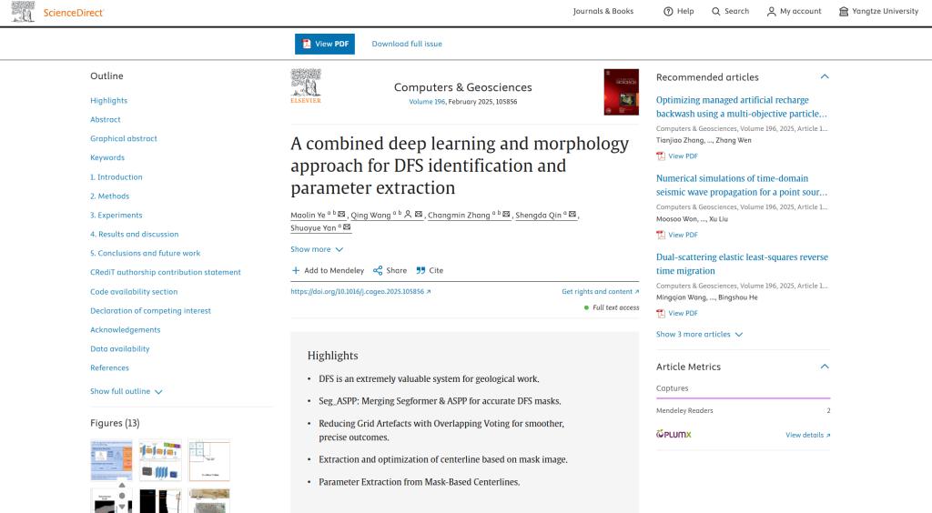 硕士生叶茂林在导师王庆副教授的指导下,于SCI二区期刊《Computers & Geosciences》发表题为《A combined deep learning and morphology approach for DFS identification and parameter extraction》的研究论文,提出一种融合深度学习与河流形态学的分布式河流系统(DFS)参数自动化提取方法,为沉积盆地分析与资源勘探提供了智能化解决方案。