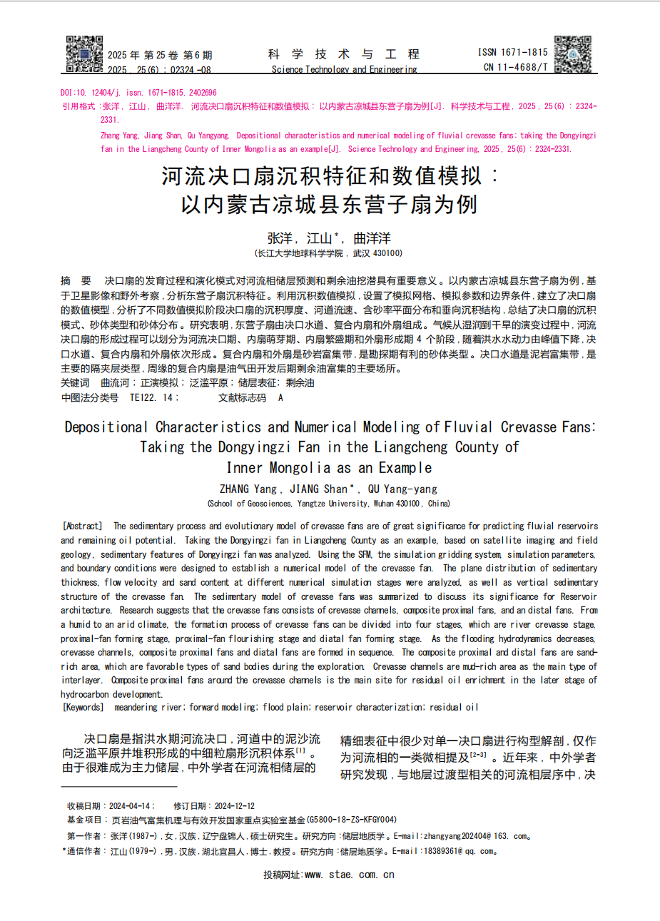 地质学专业2022级硕士生张洋在中文核心期刊《科学技术与工程》发表题为“河流决口扇沉积特征和数值模拟:以内蒙古凉城县东营子扇为例”的研究论文。嘟嘟成人网