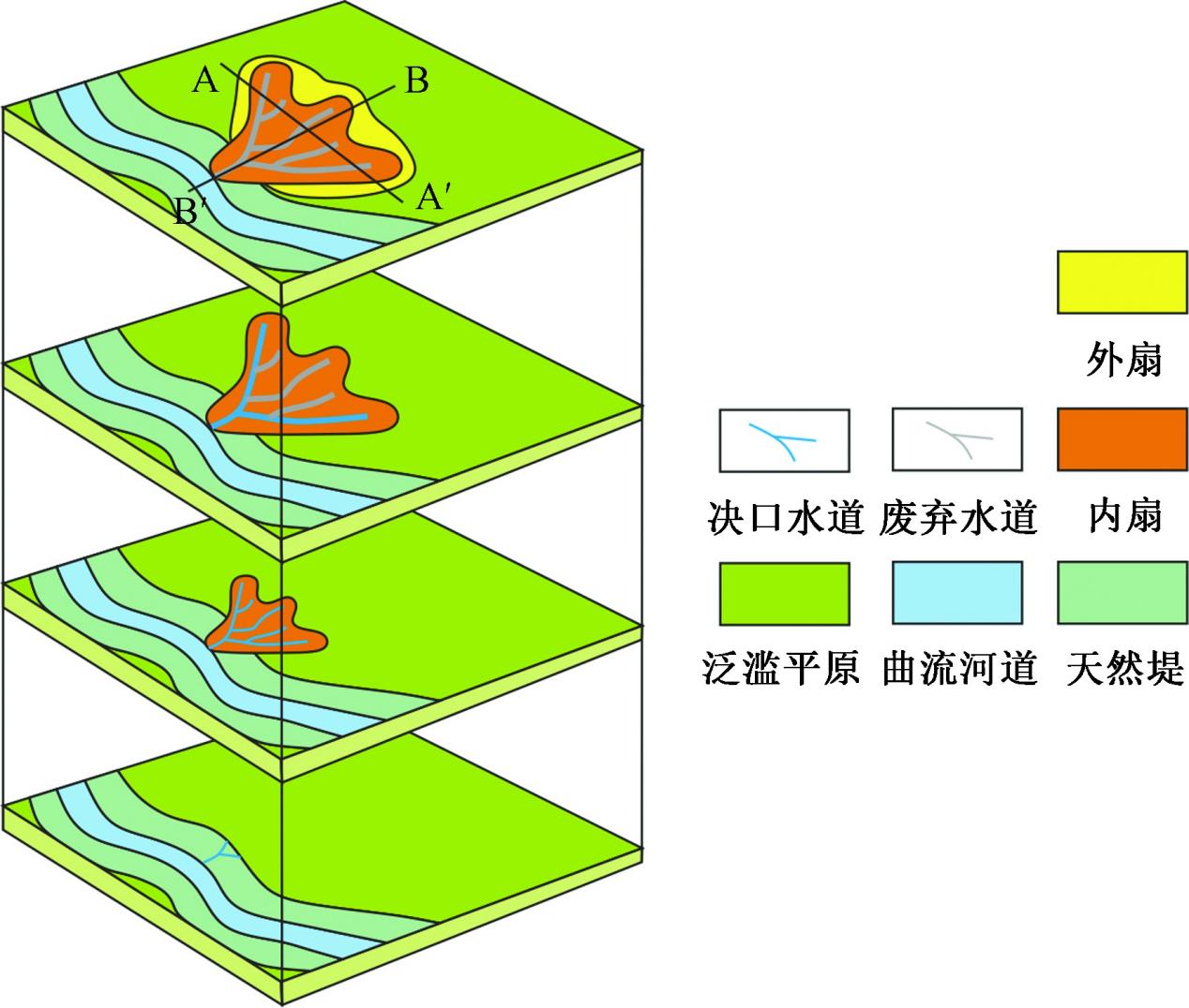 该研究基于卫星影像与野外实地勘测,结合国际领先的Delft3D沉积数值模拟技术,成功还原了决口扇从形成到消亡的全过程。研究表明,东营子决口扇由决口水道、复合内扇与外扇三部分组成,其演化受气候干湿变化驱动,可分为四大阶段:决口爆发期;内扇萌芽期;内扇繁盛期;外扇形成期。
