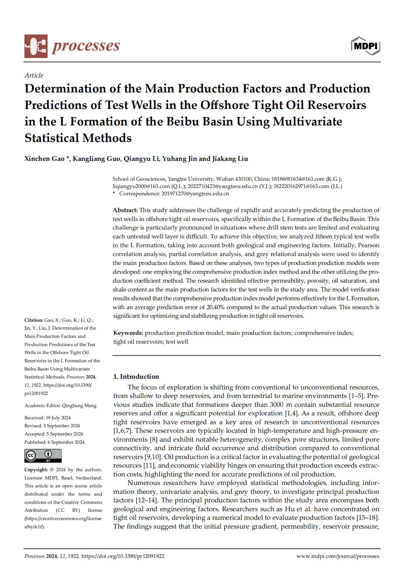 22级博士研究生在期刊《Processes》上发表题为“Determination of the Main Production Factors and Production Predictions of Test Wells in the Offshore Tight Oil Reservoirsin the L Formation of the Beibu Basin Using Multivariate Statistical Methods”的研究论文。嘟嘟成人网