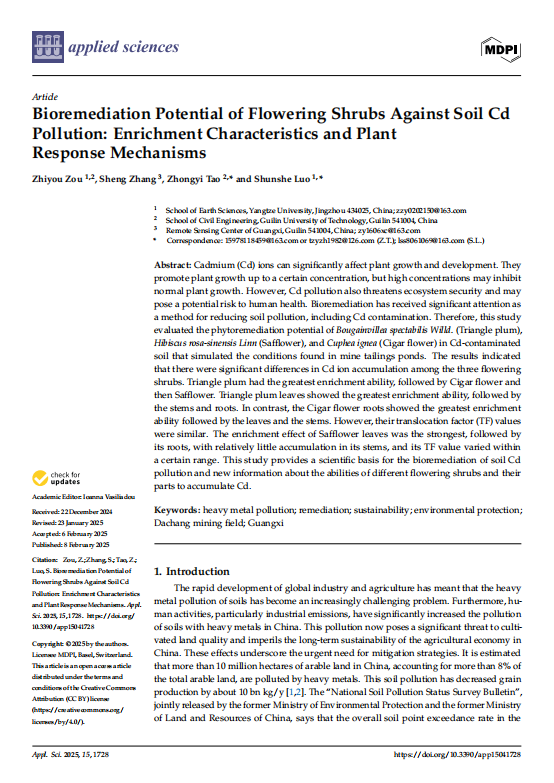、广西遥感中心及桂林理工大学联合研究团队,在《Appl. Sci.》期刊发表论文,揭示三角梅、木槿和大红花在土壤镉污染修复中的潜力。