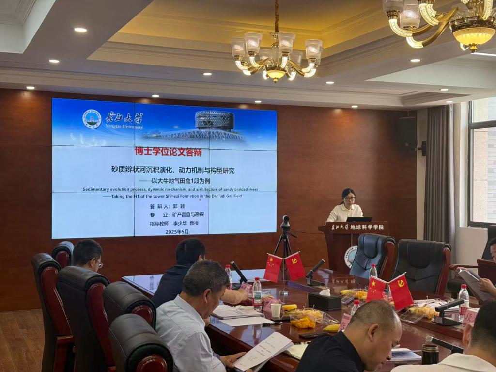 郭颖的学位论文题为《砂质辫状河沉积演化、动力机制与构型研究——以大牛地气田盒1段为例》,在导师李少华教授的指导下,针对历年水动力差异变化造成砂质辫状河沉积过程和内部构型复杂认识不清的关键地质问题展开研究。论文以大牛地气田盒一段为研究对象,综合钻井岩心、露头数据,运用沉积学、流体动力学等多学科知识,开展几十次沉积数值模拟试验,系统开展了沉积演化、沉积动力机制与构型、非均质方面的研究。将辫状河的沉积演化定量划分为四个阶段,明确了辫状水道和心滩协同演化的动力学机制,提出水动力条件控制着辫状河的沉积演化速率、辫状水道平面样式及水深、心滩的类型和叠置样式;考虑沉积过程,对不同演化阶段心滩进行精细解剖,明确不同类型心滩内部增生体的叠置样式、形成时间以及规模参数,再现砂质辫状河的平面及纵向储层非均质性特征,为地下复杂储层构型解剖提供了重要理论依据。