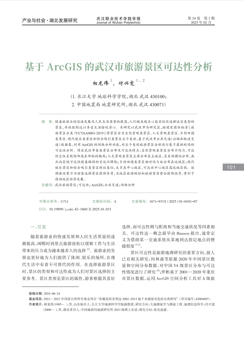 相龙伟博士在期刊《武汉职业技术学院学报》上发表题为‘基于ArcGIS的武汉市旅游景区可达性分析’的研究论文。