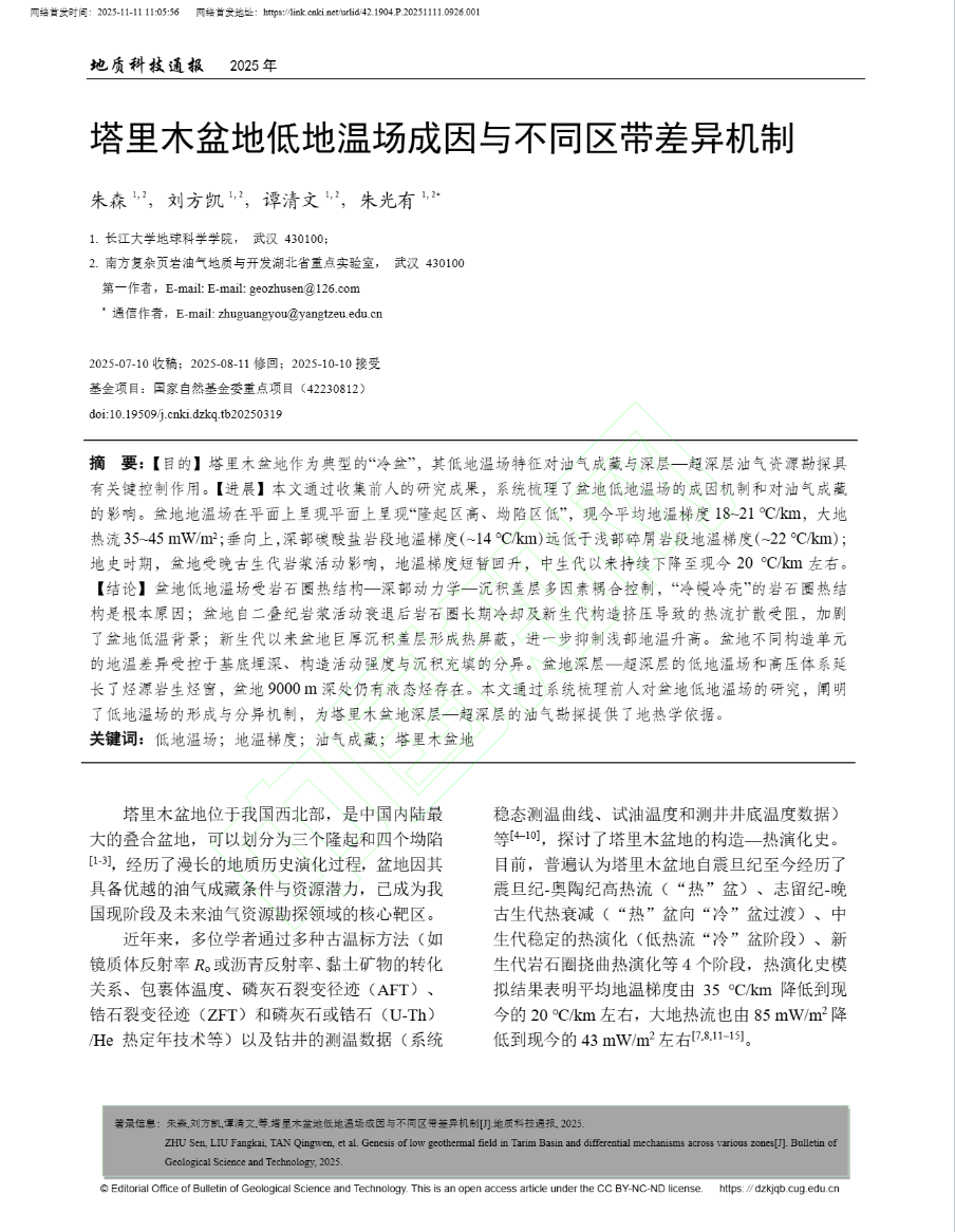 2025级矿产普查与勘探专业博士生朱森以第一作者身份在中文核心期刊《地质科技通报》上发表了题为“塔里木盆地低地温场成因与不同区带差异机制”的研究论文。博士生朱森为论文第一作者,其导师朱光有教授为论文通讯作者,嘟嘟成人网