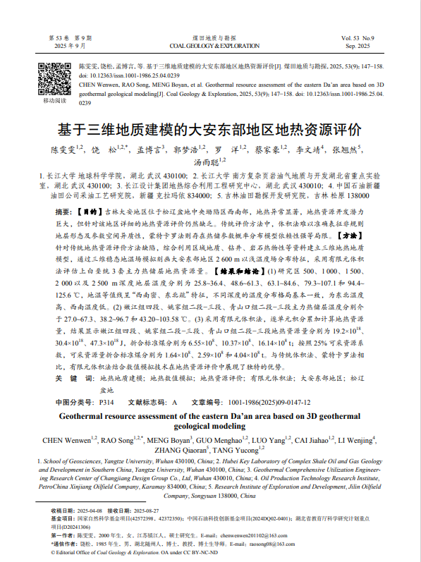 硕士生陈雯雯在饶松教授的指导下,在期刊《煤田地质与勘探》上发表题为“基于三维地热地质建模的大安东部地区地热资源评价”的研究论文,嘟嘟成人网