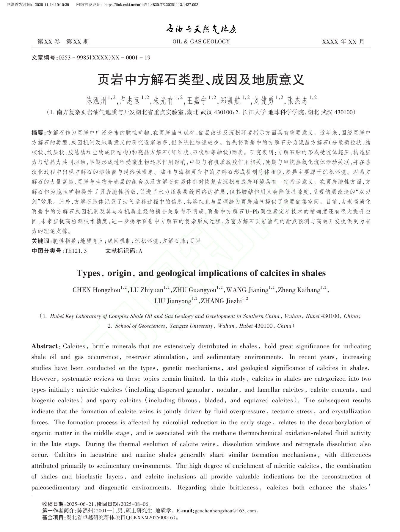 2024级地质学专业硕士生陈泓州以第一作者身份在中文EI检索期刊《石油与天然气地质》(影响因子7.149)上发表题为“页岩中方解石类型、成因及地质意义”的研究论文。嘟嘟成人网